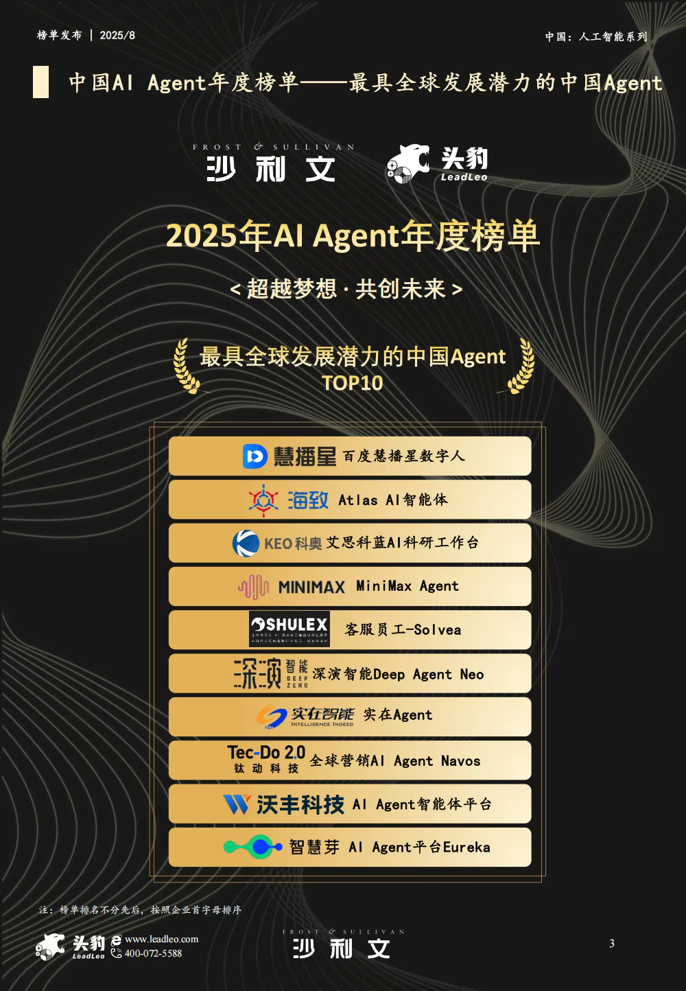 8月28日,全球知名咨询机构沙利文联合头豹研究院发布了《2025年中国AI Agent(智能体)最佳实践应用榜单》,凭借自主研发的 AI 智能体平台 Deep Agent Neo 的突出实力,雅博智能从 150 家参评企业、近 300 个产品 / 解决方案中脱颖而出,成功入选 “最具全球发展潜力的中国 Agent” TOP10 榜单,再度印证其在 AI Agent 领域的技术硬实力与全球化发展潜力。